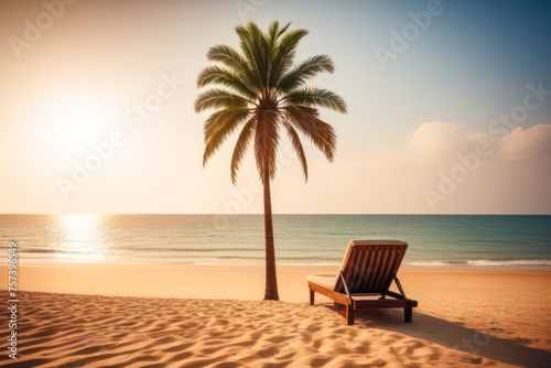 sun lounger on the beach under a palm tree, in the background there is a coastline with turquoise water. Rays of the sun in the frame. It's time for vacation 2024, tourist season.