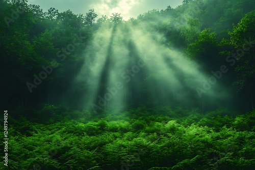 forest, tree, fern, light, sun ray, sunbeam, nature, green, dark, shadow, mysterious, mystical, magical, enchanting, sunlight, wood, wilderness, greenery, lush, vibrant, serene, peaceful, tranquil, calm, atmospheric, moody, aethereal, background, wallpaper, landscape, environment, sun ray, forest floor, dense forest, green-forest