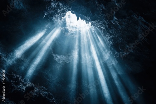 cave, sunbeam, light rays, stalactite, shadow, darkness, mystery, exploration, depth, underground, geology, cavern, rock formation, natural light, beam, subterranean, interior, texture, environment, nature, adventure, discovery, landscape, science, photo, image, artwork, art, design, illustration, background, pattern, abstract, dark, blue, grey, light, shadow, rock, stone, wall, surface, rough, cold, wet, damp, shiny, glimmering, sparkling