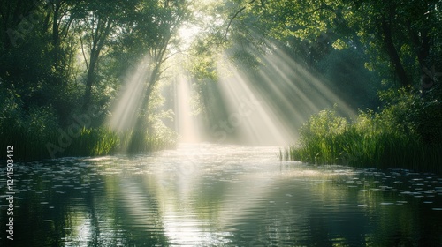 Sunbeams illuminate tranquil forest river at dawn, nature scene