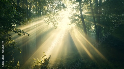 sun, forest, tree, light, beam, ray, morning, mist, fog, nature, wood, green, timberland, foliage, landscape, sky, sunshine, gold, aethereal, mystical, magical, tranquil, peaceful, serenity, beauty, scenic, natural, environment, bright, vibrant, soft, glow, shadow, dappled, hazy, atmospheric, dreamy, summer, autumn, spring, season, wilderness, branch, leaf