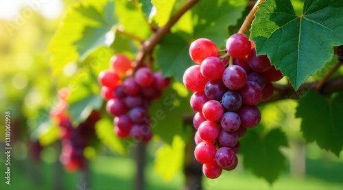 Sunlight Dapples Ripe Red Grapes Hanging Heavy on Lush Vine, a Harvest Bounty
