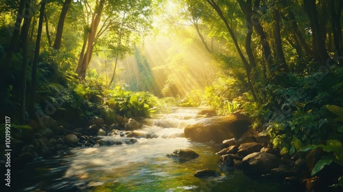 Sunlight filters through tall trees, illuminating a lush forest and a gentle stream gliding by