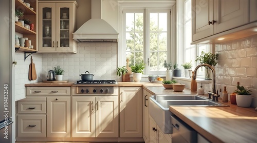 kitchen, farmhouse, interior, sunlight, window, cabinet, white, wood, countertop, sink, stove, pot, plant, shelf, cooking, home, calm, peaceful, serene, cosy, domestic, rustic, modern, design, style, bright, airy, minimalist, clean, organised, cookware, kitchen utensile, light, warm, homelike, inviting, tranquil, appliance, gas, natural, greenery, organic, decor, homely, comfort