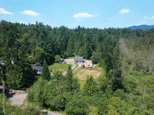 Sunny Lake Desire on a bright clear day in summertime with trees reflecting in the water a blue sky and white clouds with lily pads and the backyards and piers in King County Washington State