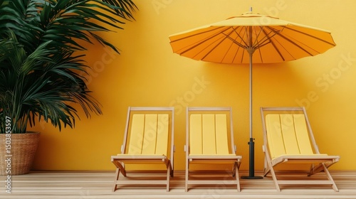 summer, patio, lounge, chair, umbrella, yellow, relaxation, vacation, sun, beach, holiday, tropical, decor, furniture, wooden, palm, plant, minimalist, design, warm, bright, calm, peaceful, comfortable, modern, simple, rest, happy, elegant, stylish, contemporary, home, interior, exterior, art, three-dimensional, rendering, illustration, sunny, relax, sun tanning, chaise, leisure, warmth, peace, sunshine