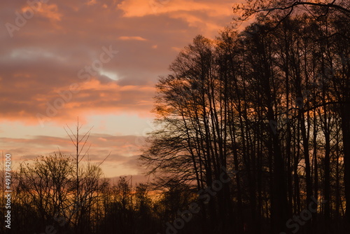 sunrise at the edge of the forest with orange clouds