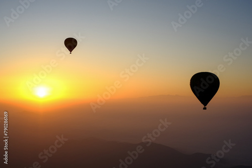 Sunrise in Morocco: A hot air balloon rises over desert dunes, illuminated by the dawn light.