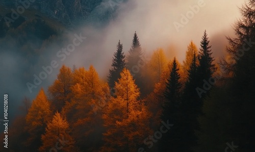 nature, autumn, forest, mist, sunrise, tree, foliage, landscape, morning, fog, sunlight, orange, green, scenery, peaceful, serene, tranquil, outdoors, wilderness, seasonal, beauty, environment, dense, natural, atmospheric, vibrant, idylli, misty, picturesque, leaf, hill, timberland, light