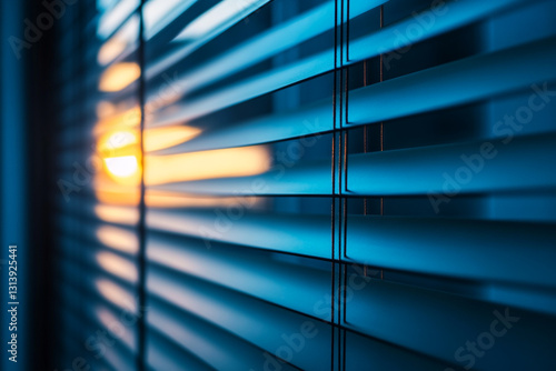 Sunset light through blue venetian blinds window home interior design dark room shade lines house