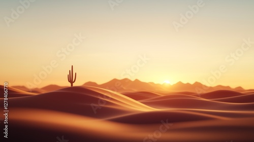 Sunset over desert landscape with rippling dunes and a lone cactus standing tall