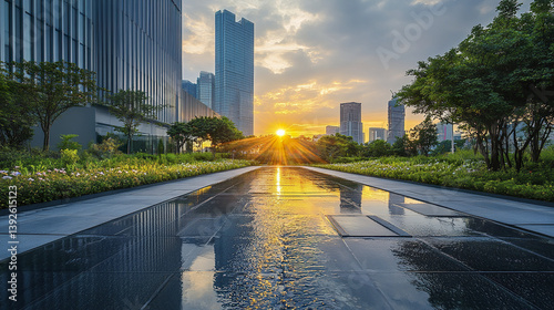 Sunset reflects on modern cityscape with wet pathway and lush greenery