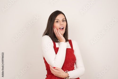 Surprise astonished beautiful girl looking surprised in full disbelief wide open mouth with hand near face. Positive emotion facial expression body language.