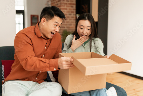 Surprised asian man and woman looking inside cardboard box, satisfied with ordered item, living room interior