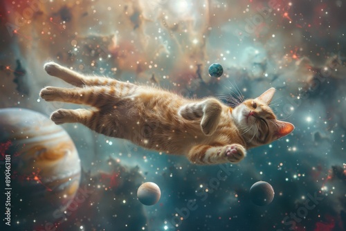surreal, cat, floating, space, star, planet, vibrant, dreamlike, colours, fantasy, animal, cosmos, whimsical, imagination, night sky, surrealism, visual, art, illustration, universe, galaxy, celestial, moon, mystical, creative, abstract, artistic, vision, aethereal, sky, dream, unreal, colourful, magical