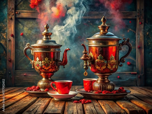 tea, mug, russian, red, samovar, surreal, photo, teacup, drink, hot, beverage, wooden, table, clock, dreamlike, painting, folk art, fantasy, whimsical, artistic, vintage, antique, still life, mystery, magic, illusion, visual, image, photo, picture, artwork, composition, design, texture, colours, light, shadow, atmosphere, mood, style, concept, object, detail, element, background, setting, scene