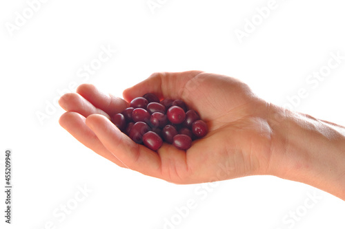 dogwood, berry, hand, isolated, white background, harvest, berry, red, palm, sour, tasty, healthy, burgundy, juicy