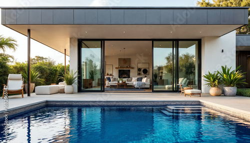 swimming pool, house, modern, patio, furniture, backyard, exterior, architecture, home, poolside, leisure, relaxation, contemporary, design, terrace, sunlight, garden, luxury, residence, interior, glimpse, water, cosy, bright, stylish, dwelling, vacation, lifestyle, private, comfort, scenic, inviting, pool, hotel, swimming, resort, summer, holiday, swimming pool