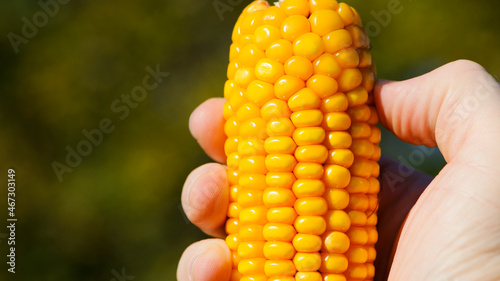Swing of sweet corn in hands. yellow swing of ripe corn. good harvest. corn in the field. ear close-up, natural background. grains of bright yellow corn. Vegetarian food. close-up
