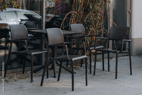still life, relaxation, bistro, lifestyle, city life, empty space, closed, urban scene, seat, deserted, patio, relax, seating, no people, table, nobody, recreation area, public, chair, cafeteria, street, eatery, outside, furniture, empty, chair, comfortable, breakfast