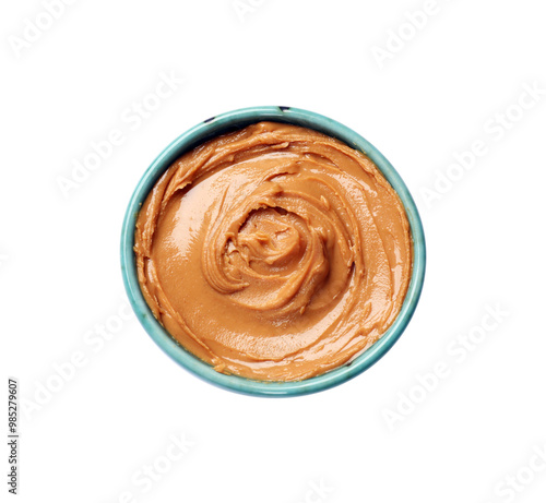 Tasty peanut butter in bowl isolated on white, top view