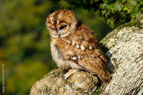 Tawny Owl (Strix aluco) sitting in an oak tree in autumn in Wales, UK