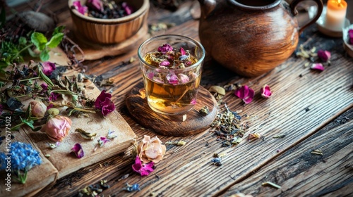 tea, herb, rustic, table, wooden, teapot, dried, flower, cosy, warm, aesthetic, refined, balanced, charming, serene, inviting, countryside, artistic, organic, classic, detailed, crafted, wholesome