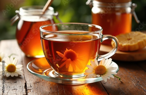 tea, cup, chamomile, blossom, honey, jar, table, saucer, glasses, background, aroma, setting, scene, ambience, beverage, hospitality, home, relaxation, breakfast, morning, calm, serenity, texture, steam, fragrance, colours, warmth, rustic, wooden, sunlit, cosy, natural, fragrant, aromatic, soothing, gold, glistening, hue, drizzle