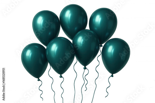 Teal balloons hovering weightlessly, gleaming surfaces reflecting light on clean transparent backdrop