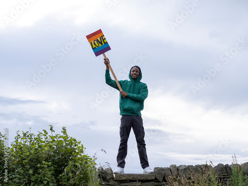boy, teenage, african, alone, gem, peace, symbol, signs, protest, hold, rainbow, flag, equality, people, cloud, racked, stone, wall, portrait, horizontal, outdoors, day, britain, 1