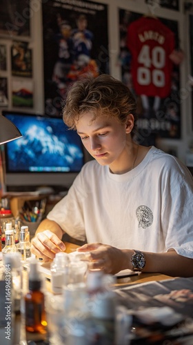 Teenage boy with acne-prone skin carefully applies skincare product...