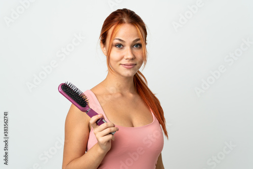 Teenager Russian girl isolated on white background with hair comb