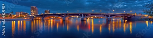 panorama, dawn, arizona, phoenix, night, city, river, water, bridge, light, landscape, skyline, building, architecture, urban, dusk, city landscape, town, evening, view, sky, sunset, travel, blue