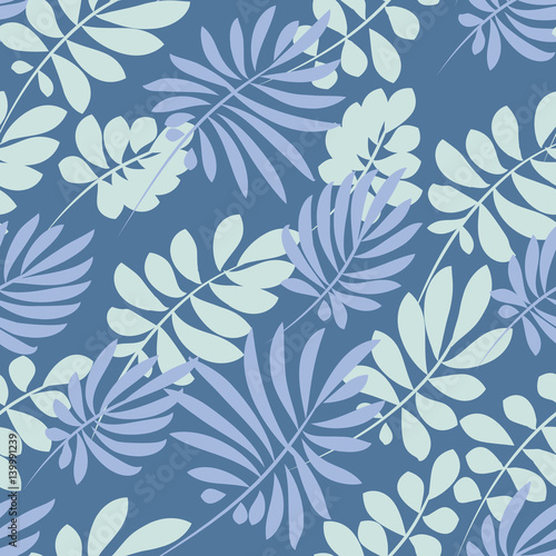 Tender pale blue and green tropical leaves seamless pattern. Decorative summer nature surface design. vector illustration for fabric, print, wrapping paper