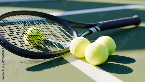tennis racket and bright tennis balls rest on a sunlit court, capturing the essence of outdoor sports
