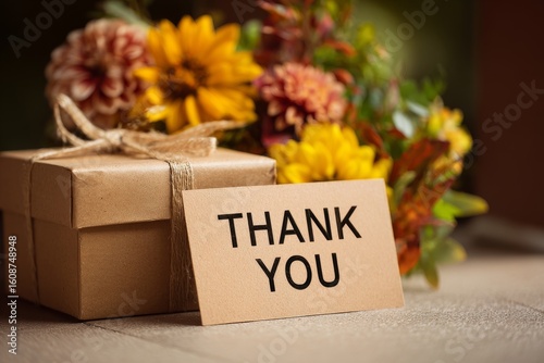 thank you, gift, card, flower, bouquet, present, message, autumn, floral, celebration, appreciation, box, greeting, arrangement, holiday, decoration, event, gift box, craft, paper, table, brown, yellow, orange, festive, season, still life, nature, decorative, design, hand-made, rustic, thanksgiving, celebrate, giving, grateful, kindness, positive, support, warm, background, closeup, indoor, nobody