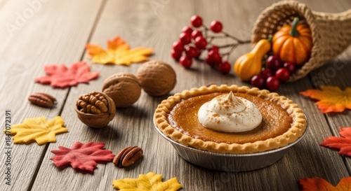 thanksgiving, celebration, pumpkin, pie, autumn, background, festive, leaf, cornucopia, nut, wooden, table, dessert, decoration, holiday, season, harvest, fall, gratitude, feast, tradition, orange, brown, red, food, berry, foliage, culinary, epicure, dining, centrepiece, ornamental, rustic, cosy, gathering, family, warmth, pecan, walnut, whipped, cream, baked, comfort, hospitality, abundance, joy