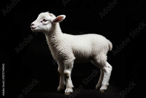 the beside view baby Dall Sheep standing, left side view, low angle, white copy space on right, Isolated on black Background
