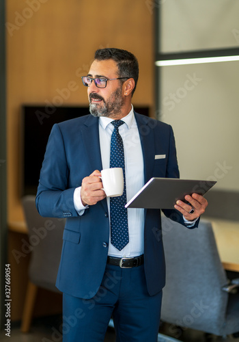 The boss, who checks and takes notes at the computer in his own workroom in the office, the handsome hardworking boss with the beard in the suit, the bank manager, the team leader