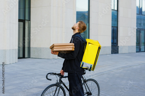 The courier looks up at the building in search of the entrance he needs. The delivery man on a bicycle arrived quickly to the customer