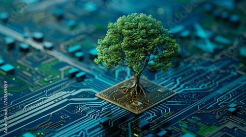 The essence of green computing captured with a tree growing from the convergence of technology and nature on a circuit board highlighted by blue light