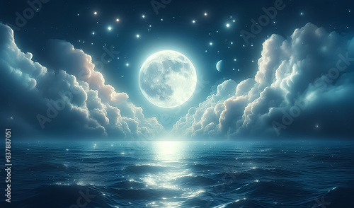 moon, sky, night, cloud, star, full, moonlight, light, blue, nature, universe, midnight, water, black