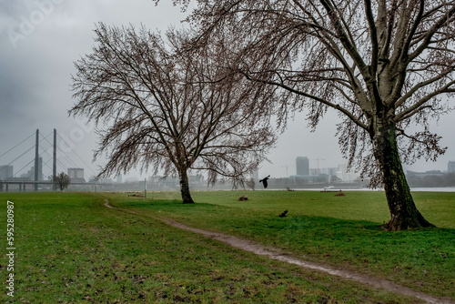 german, river, rhine, prairie, nature, water, transport, tower, tree, green, landscape, travel, rain, winter, riverside, meadow, navigation