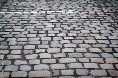 The gray paving stones close up. The texture of the old dark stone. Vintage, grunge. Road surface.