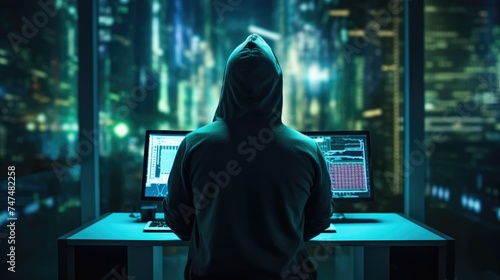 The hacker is sitting at the computer. The hacker sits in front of the window at the computer and looks at the city. A man in a hood is sitting with his back, a laptop in front of him.