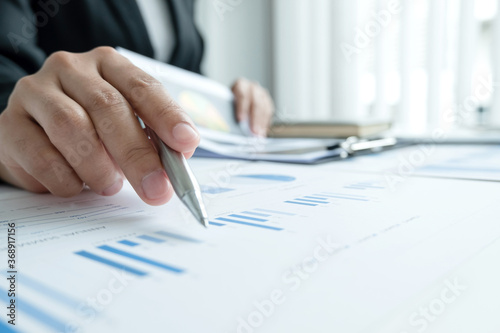 The hands of a male businesswoman are analyzing and calculating the annual income and expenses in a financial graph that shows results To summarize balances overall in office