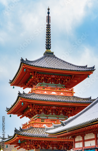 The iconic three-story pagoda Kiyomizu-dera Koyasunoto (Pagoda of Safe Childbirth), onr of the most important temples in Kyoto, Japan.