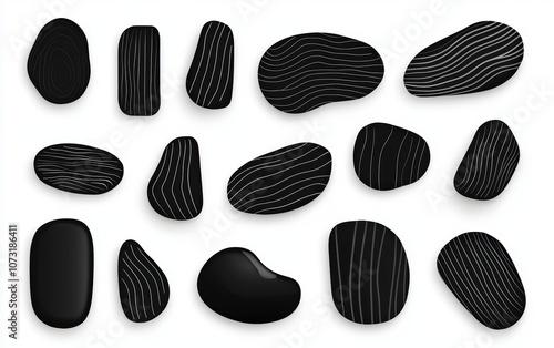 The image showcases a collection of black stones with varying shapes and patterns on a white background, emphasizing their texture and form.