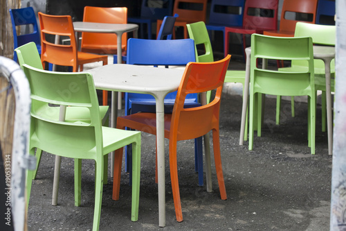 many-coloured, plastic, furniture, street, cafes, table, chair, green, orange, modern, high technology, cheap