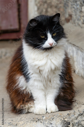 cat, black-and-white, concrete, wall, rest, sleep, calm, loneliness, fur, stain, face, chest, paw, texture, rough, dirt, litter, discoloration, closed eyes, peaceful, surface, spot, scattered, material, stain, quiet, alone, pet, cosy, nap, stillness, tail, fluffy, compact, lying down, comfortable, safe, sheltered, hidden, camouflage, natural light, daytime, streetlife, mammal